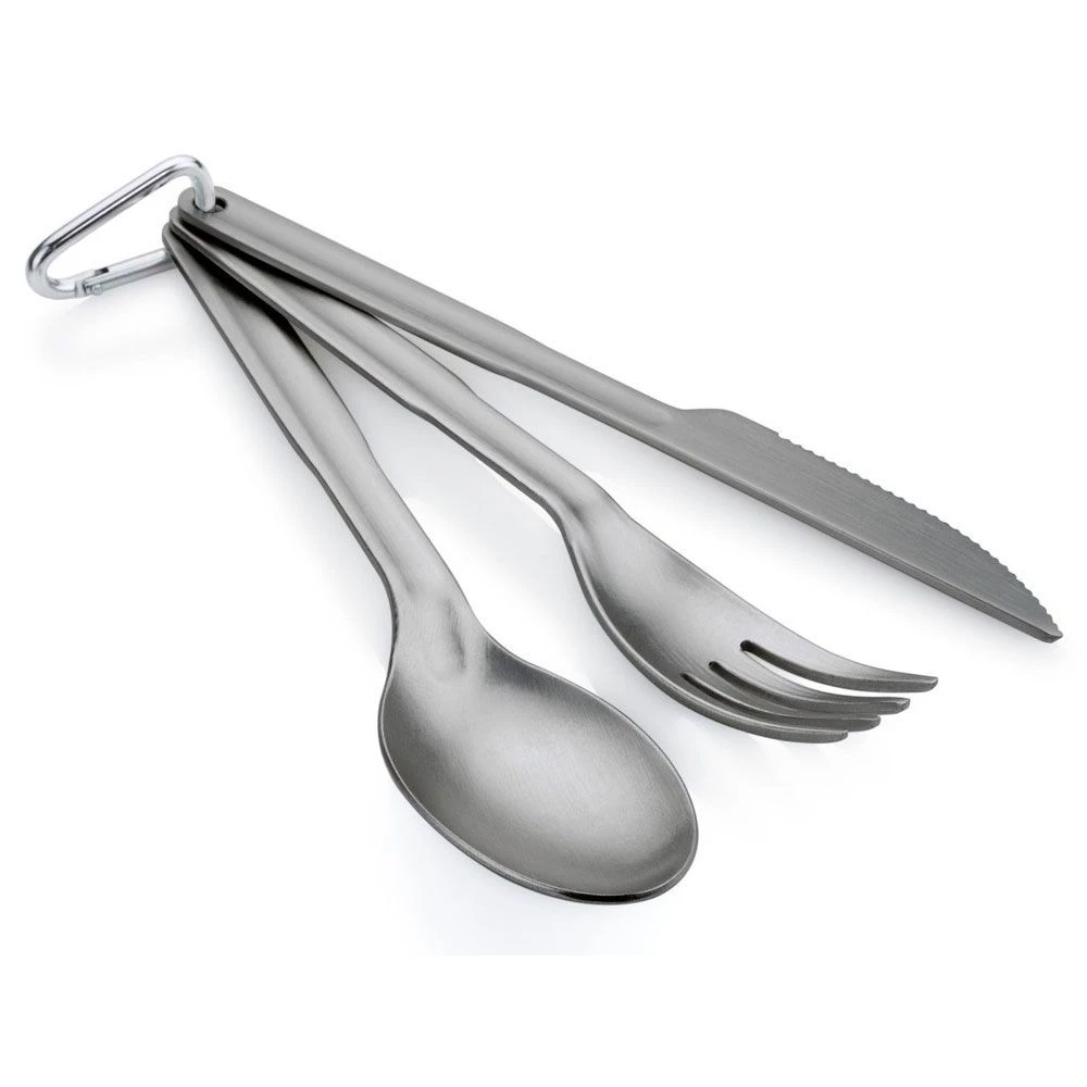 De Halulite bestekset van GSI Outdoors is zeer praktisch om mee te nemen wanneer u reist. Deze set bestaat uit een mes, vork en lepel. Door middel van een karabijnhaak kan de set eenvoudig bij elkaar gehouden worden en door het formaat is de bestekset compact op te bergen.