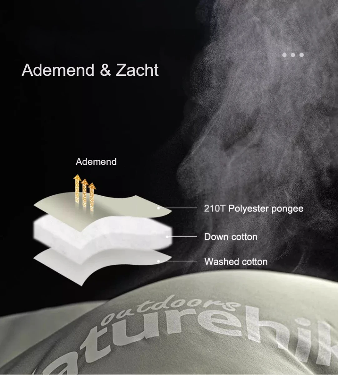 - Buitenlaag is gemaakt van waterdicht nylonweefsel. De vulling betreft katoenvezels en de voering zijdezacht en comfortabel imitatie katoen.